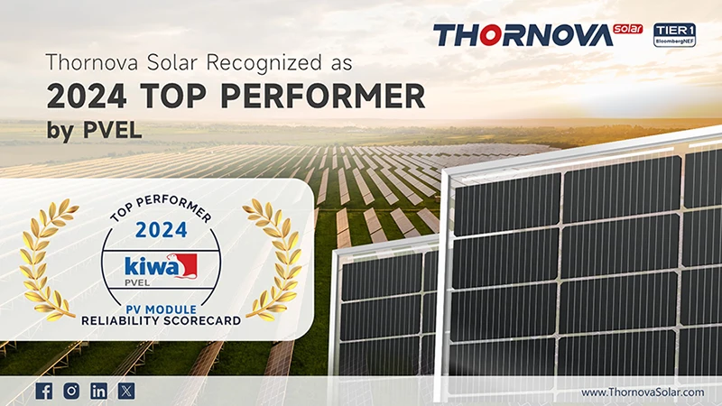 "Congratulations to Thornova Solar for receiving the Top Performer status for the 2024 Scorecard editions," commented Tristan Erion-Lorico, VP of sales and marketing at Kiwa PVEL. "As a newcomer to our PQP program we are impressed with the strong results achieved in 5 categories, which shows the company's commitment to provide high quality PV modules to its customers."