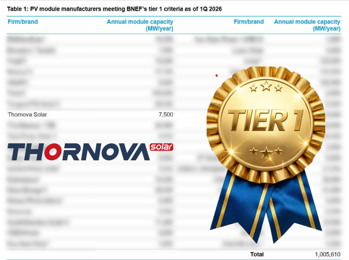 Fremont, CA, USA, 25. February 2026 – Thornova Solar is pleased to announce that it has been recognized as a BloombergNEF (BNEF) Tier 1 solar module manufacturer in the Q1 2026 list again, marking a significant milestone in the company’s global growth and industry positioning.